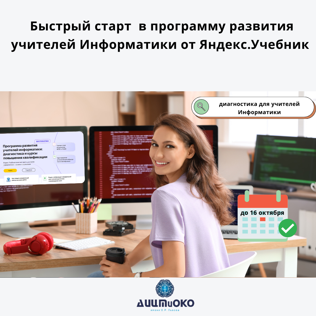 Приглашаем учителей Информатики пройти профессиональную диагностику до 16 октября на платформе Яндекс.Учебник для быстрого старта в программу развития от Яндекса. Задания охватывают разные области Информатики.