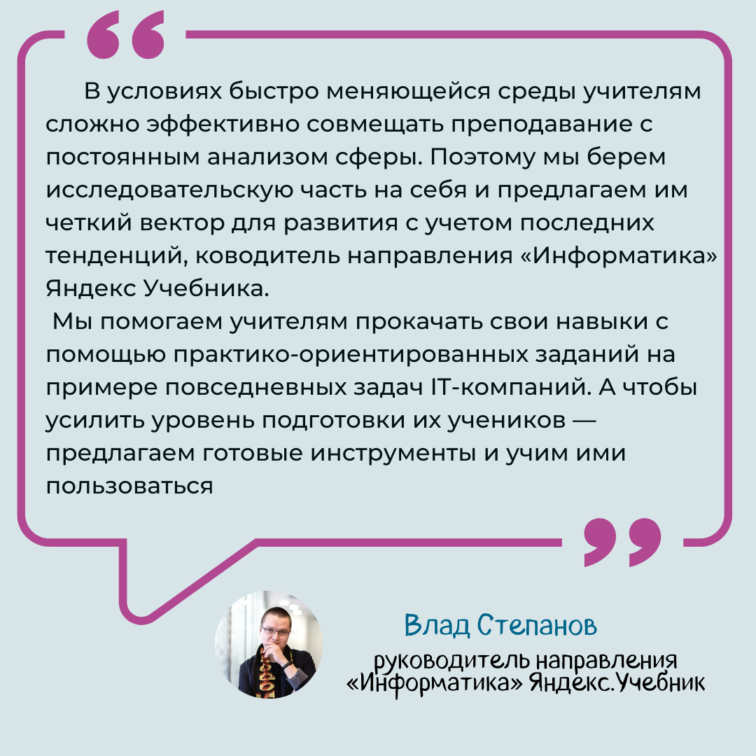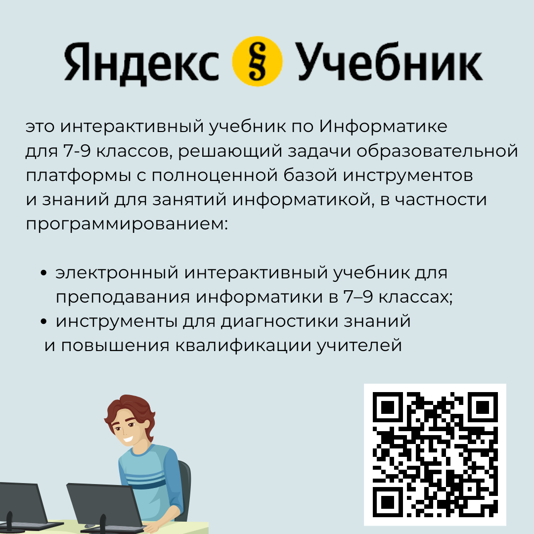 По итогам диагностики преподавателям предложат пройти бесплатный базовый или углубленный курс повышения квалификации. Программа, разработанная Яндексом и включенная в федеральный реестр ДППО, содержит четыре тематических раздела: информационно-коммуникативные технологии, алгоритмы, информационные технологии и программирование.