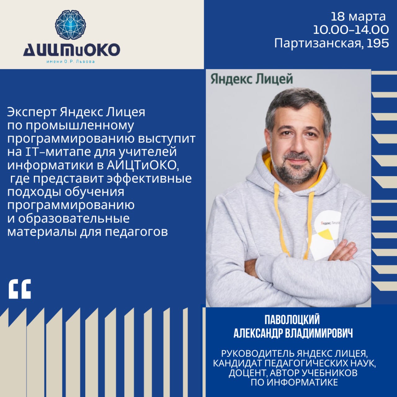 18 марта в АИЦТиОКО пройдет весенний учительский IT-митап по анализу подходов в обучении школьников промышленного программирования